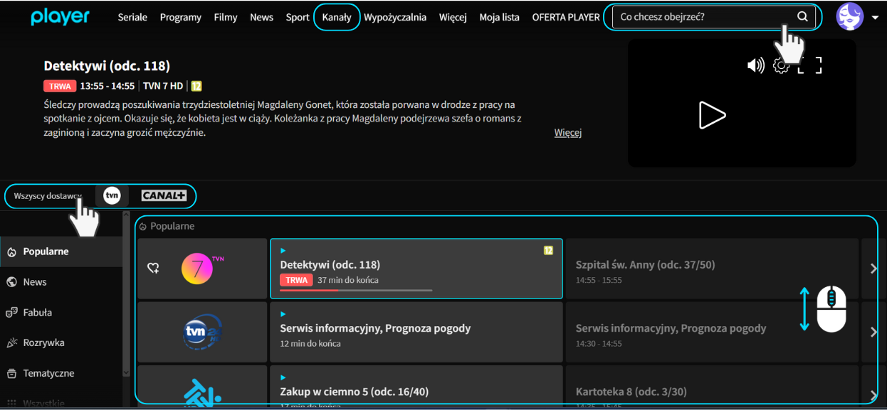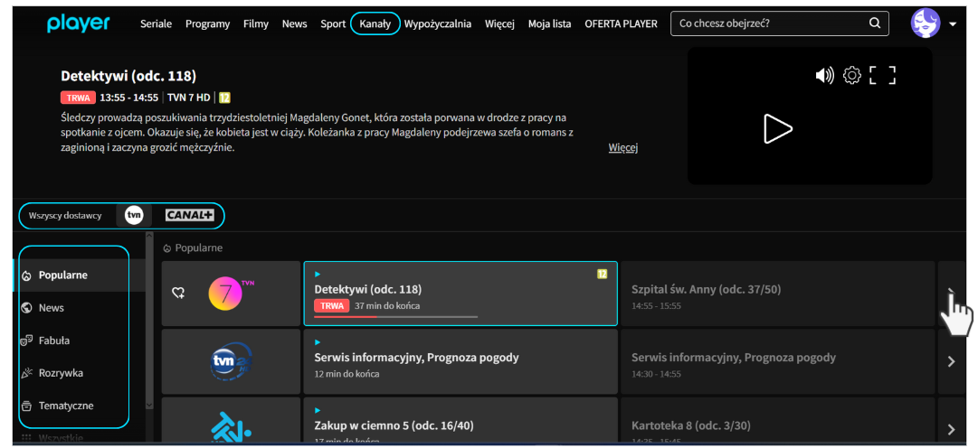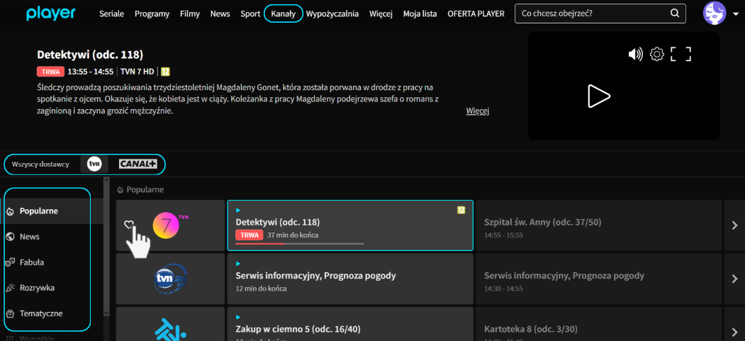 Masz dostęp do kanałów na żywo, ale nie wiesz, w jaki sposób obejrzeć programy, które były już emitowane lub chcesz dodać kanał do ulubionych? Wybierz interesującą Cię kategorię i sprawdź jak korzystać z funkcjonalności w Playerze ⤵️