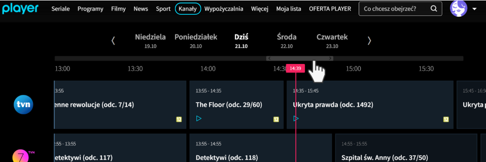 4. Odszukaj kanał, który chcesz oglądać. Za pomocą suwaka znajdującego się nad listą kanałów znajdź interesujący Cię program, a następnie w niego kliknij. Zostaniesz przeniesiony do odtwarzania kanału w wybranym momencie.