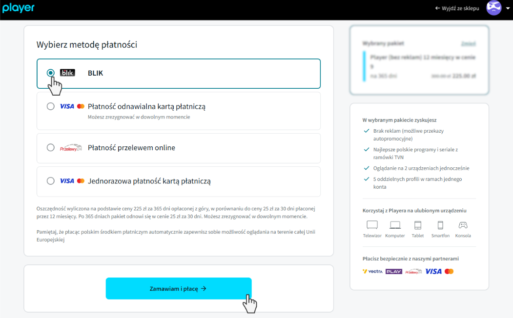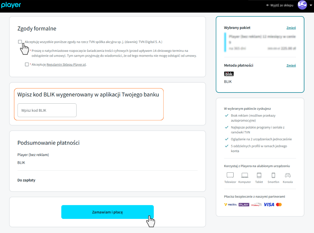 W Sklepie Player wybrane pakiety możesz opłacić bezpieczną i prostą metodą BLIK. Poniżej znajdziesz krótką instrukcję tej płatności krok po kroku. ⤵️