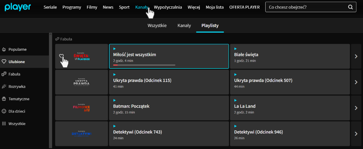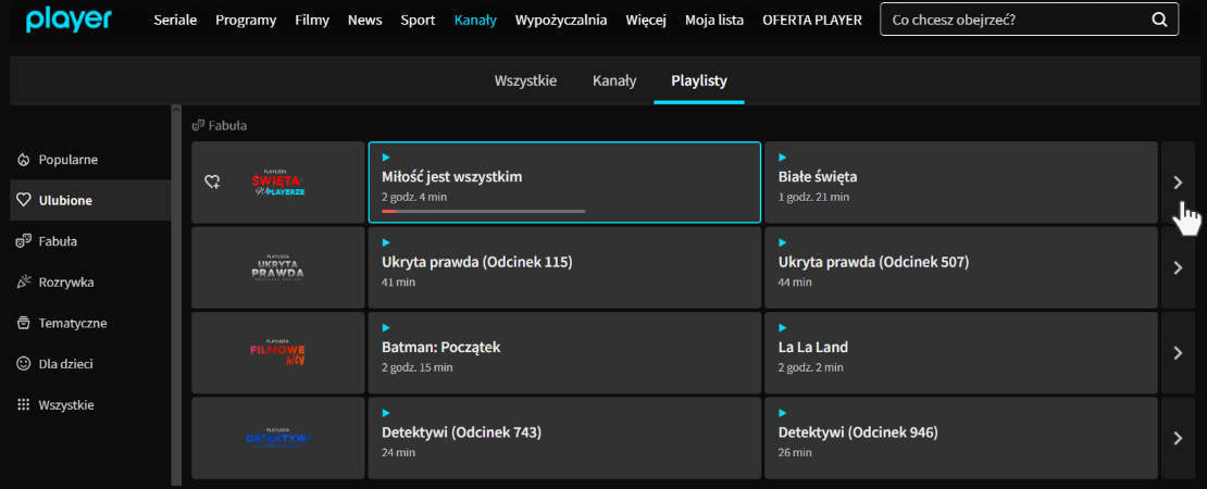 Playlisty w Playerze to nowa funkcjonalność, którą znajdziesz w kategorii Kanały. Oferują one swobodę i elastyczność – umożliwiają wybór tytułów do obejrzenia, przeskakiwanie między nimi, zatrzymywanie w dowolnym momencie, wznawianie odtwarzania czy przewijanie wybranych fragmentów. Dzięki temu oglądasz to, co lubisz!