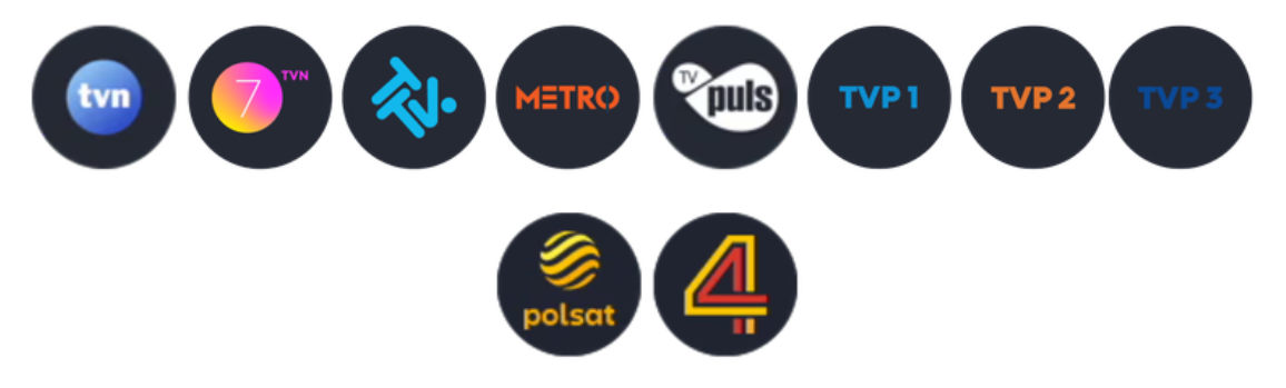 - Kanałów TVN, TVN7, TTV, Metro i TV Puls, Polsat, TV4, TVP1, TVP2 i 16 kanałów regionalnych TVP3 na żywo* oraz tematycznych kanałów nowej generacji, nadawanych przez internet (dostępne również poza pakietem, dla każdego zalogowanego użytkownika Playera)