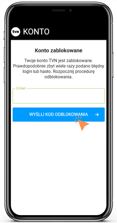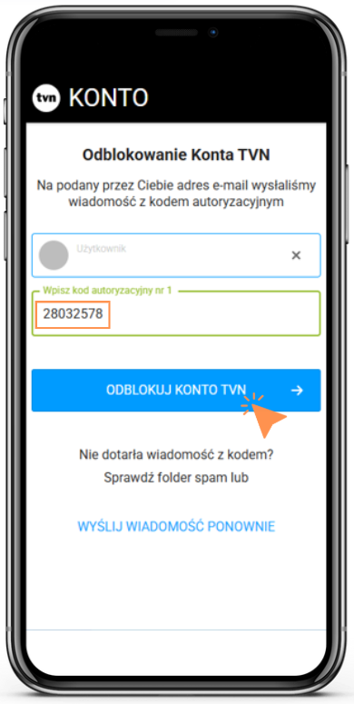 - Na podany adres e-mail otrzymasz widomość z kodem, który pozwoli odblokować Twoje konto. Skopiuj go, wprować w wyznaczone miejsce i wybierz Odblokuj konto TVN.